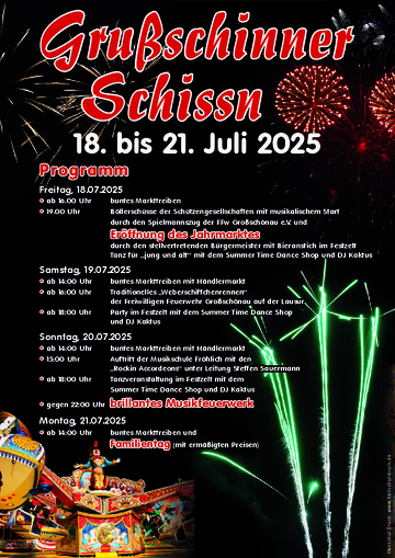 - 19.00 Uhr Böllerschüsse mit musikalischem Start durch den Spielmannszug der FFw Großschönau e.V. und Eröffnung des Jahrmarktes durch den stellvertretenden Bürgermeister mit Bieranstich im Festzelt & Tanz für „jung und alt“ mit dem Summer Time Dance Shop und DJ Kaktus